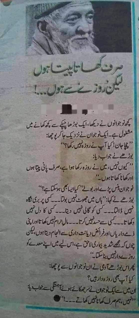 Budhe ne jawab diya kyun nahi maine roza rakha huwa hai, sirf khana khata hoon aur pani peeta hoon. Naujawan hans pada aur bola, kya aisa bhi hosakta hai?